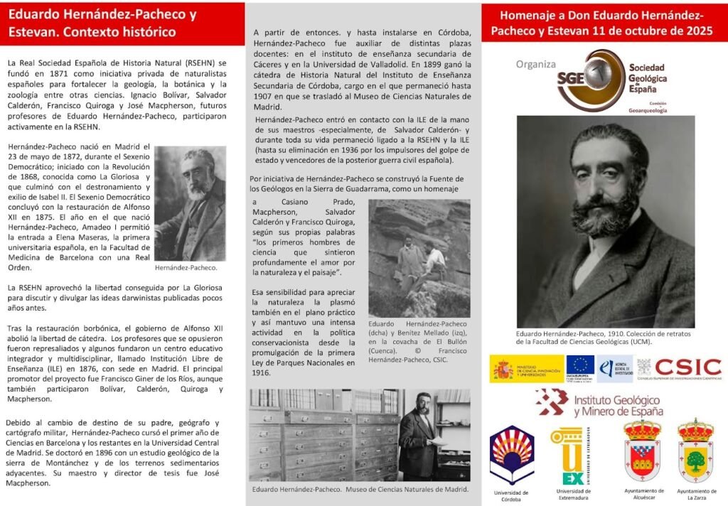 La Comisión de Geoarqueología de la Sociedad Geológica de España (SGE), en colaboración con el Centro Nacional Instituto Geológico de España (IGME-CSIC), los Ayuntamientos de La Zarza (Badajoz) y Alcuéscar (Cáceres), la Universidad de Extremadura y la Universidad de Córdoba, organizan el próximo sábado 11 de octubre de 2025 una jornada de homenaje a Don Eduardo Hernández-Pacheco y Estevan (1872-1965), destacado geólogo, arqueólogo, naturalista y pionero en los estudios de conservación del patrimonio natural y cultural en España.