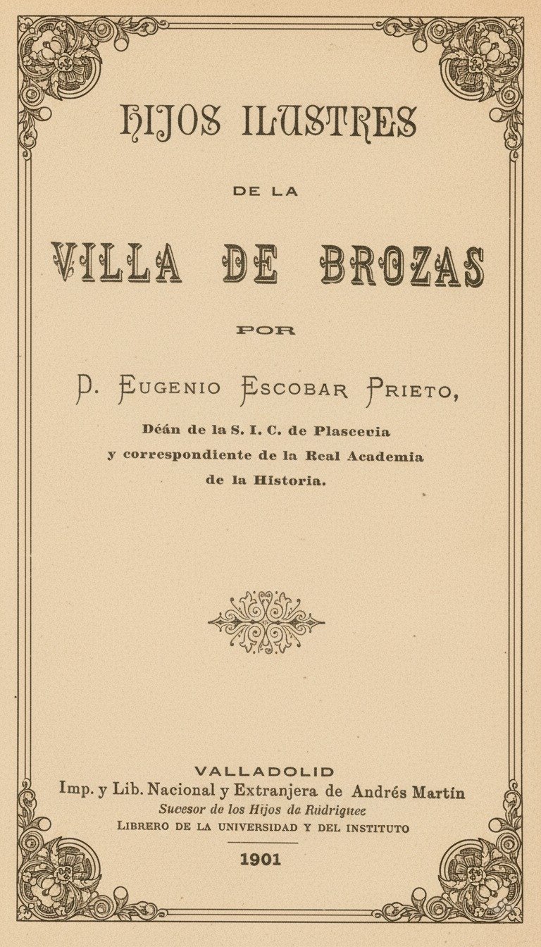 Hay un índice de autores y de personas que tratan estos temas, entre los que tengo el honor de encontrarme al hablar de Eugenio Escobar Prieto, el autor que publicó en 1901 en Valladolid el libro de “Hijos ilustres de la villa de Brozas”, y del que se conoce muy poco en el pueblo. Rebuscando y rebuscando he encontrado dos imágenes suyas, además de la pequeña biografía que reseña González Manzanares y que replico a continuación:
