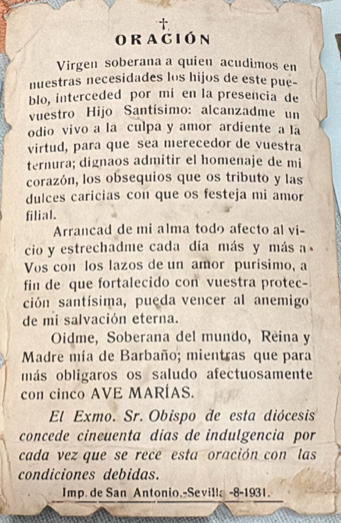 Cuenta Montijo con una Patrona cuya advocación se remonta a unos centrados entre el Medievo y la Modernidad. Uno de los aspectos que obviamente más nos interesa desde el punto de vista de la investigación en torno a la Historia de esta Hermandad bajo la devoción de Nuestra Señora de Barbaño es precisamente la constante renovación de su devenir histórico. Se trata de una institución que tiene sus orígenes documentales en el siglo XVI y sus antecedentes devocionales incluso más atrás en el tiempo, la historia y el conocimiento de la misma nos es siempre de gran interés. Es interesante cómo el pueblo montijano sabe retener en su «memoria colectiva» aquellos recuerdos y aquellos momentos que precisamente de la mano de la historia más le acerca a su actual presente y a su devoción actual (siempre interesante desde el campo por ejemplo de la Historia de las Mentalidades o de la propia Historia Social). Nos ha llegado una imagen enviada por María Gutiérrez Viloria sobre una imagen de la Stma. Virgen de Barbaño Patrona de Montijo, con su oración correspondiente del año 1931.