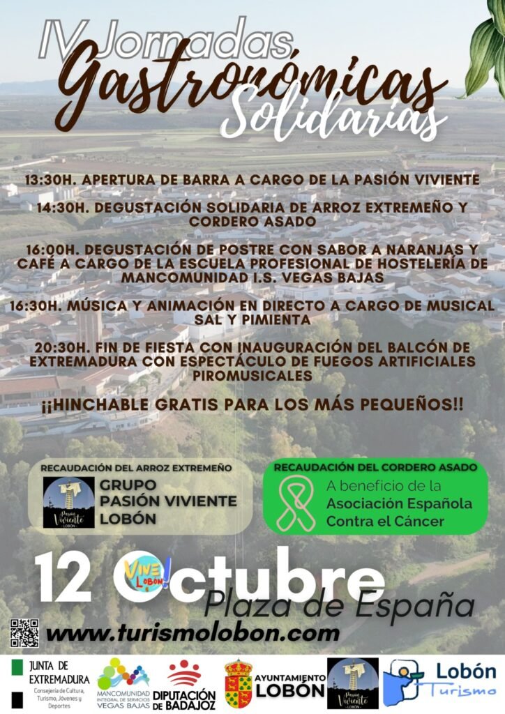 Mañana domingo, 12 de octubre, organizadas por el Ayuntamiento de Lobón, con la colaboración de la Consejería de Cultura, Turimo, Jóvenezsy Deporte; Diputación de Badajoz y la Mancomunidad I.S. Vegas Bajas. Las actividades comenzarán a las 13,30h en la Plaza de España, donde se tendrá una degustación de arroz extremeño y cordero asado (recaudación que irá destinada al Grupo Pasión Viviente Lobón y Asociación Española contra el Cancer).