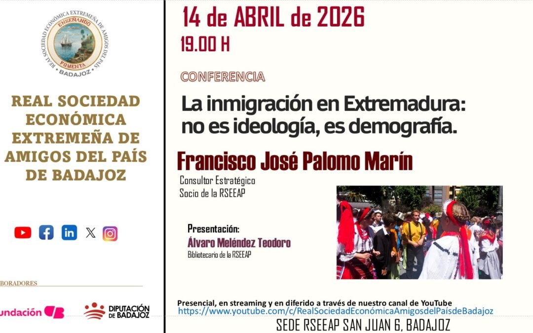 Esta tarde, la Real Sociedad Económica Extremeña de Amigos del País (RSEEAP) de Badajoz acoge una cita imprescindible para entender la realidad social y poblacional de nuestra región. Bajo un enfoque técnico y estratégico, se analizará el papel de la inmigración desde una perspectiva demográfica.