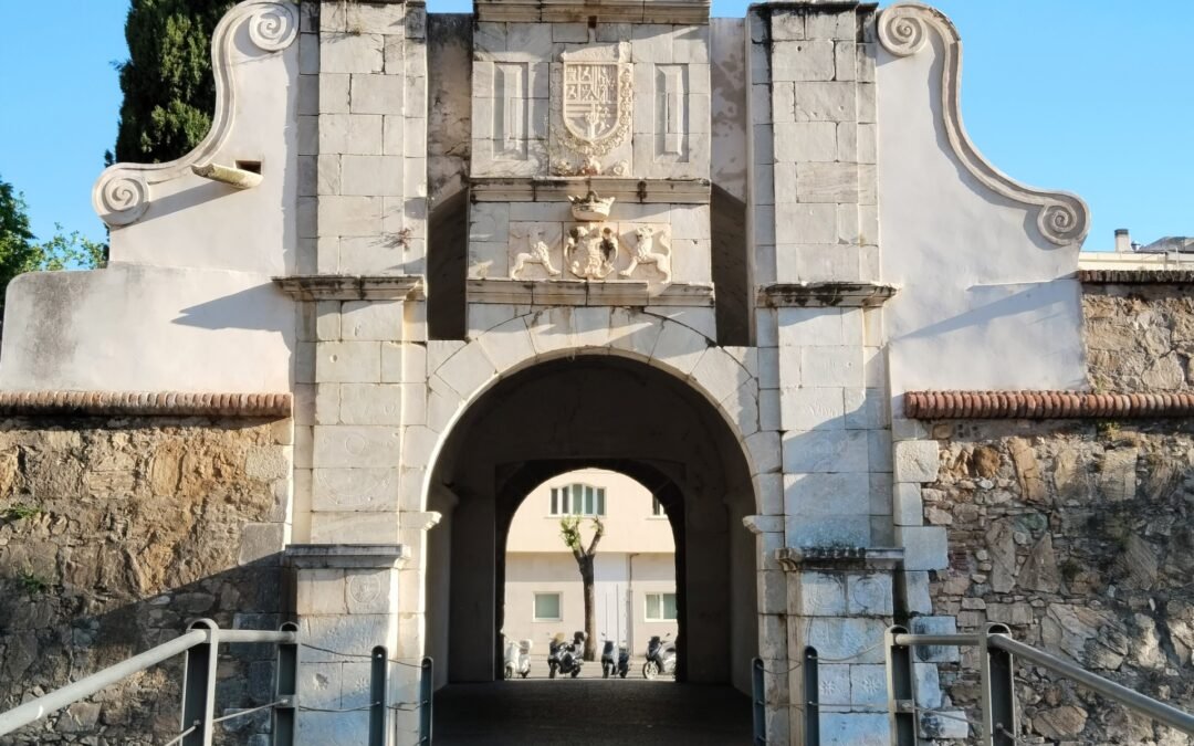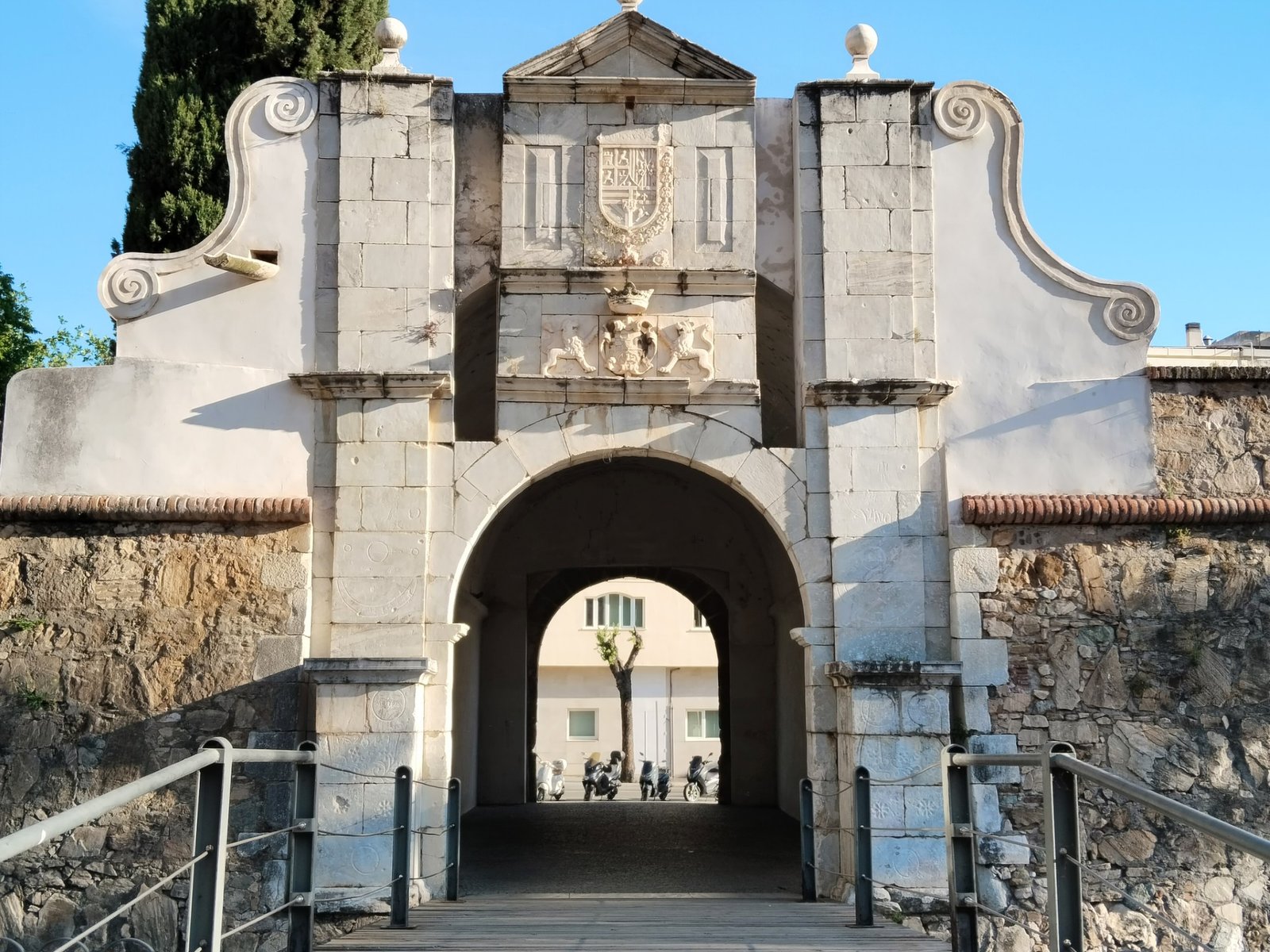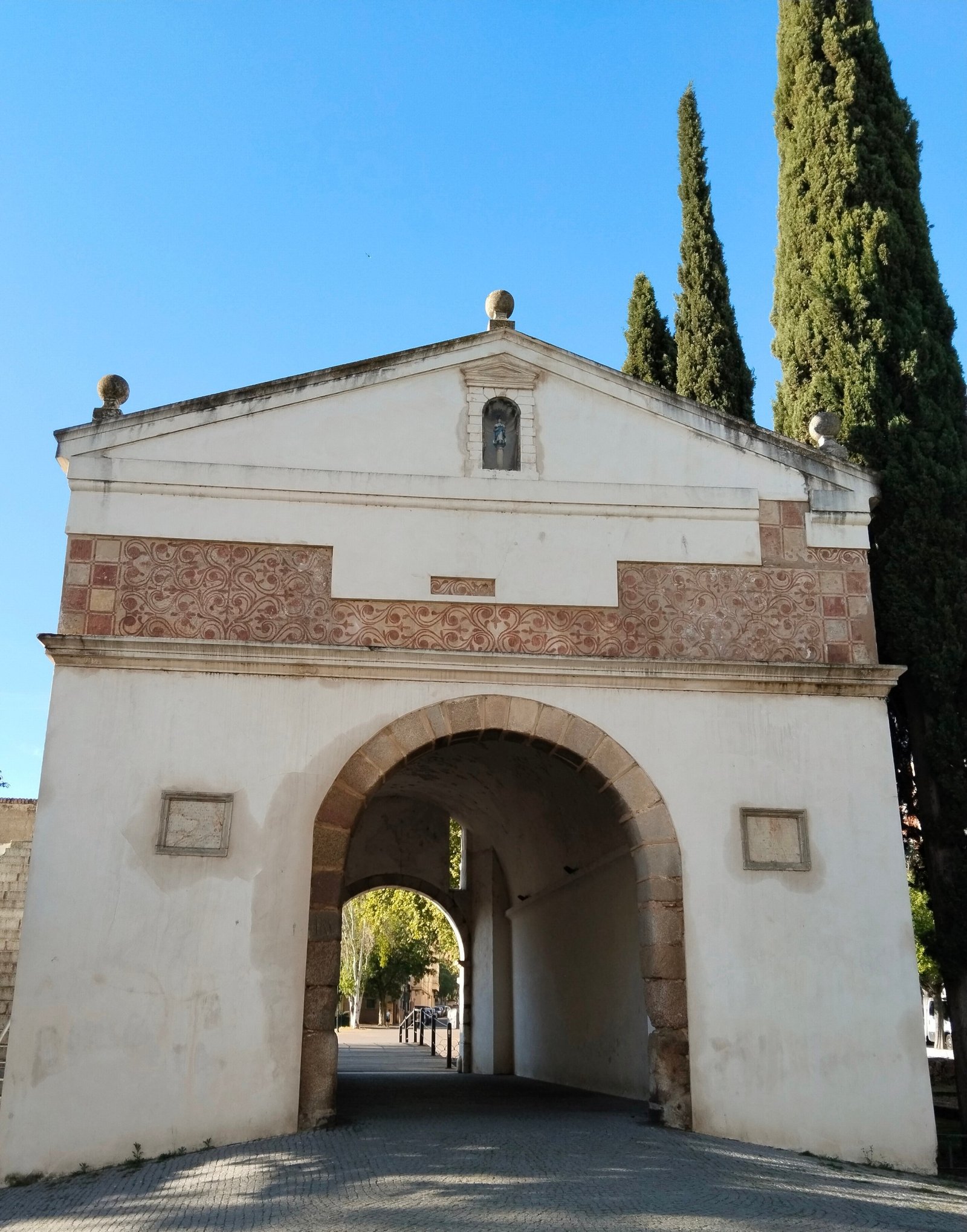 Se construyó en 1692 en la cortina de San Juan, cuando se edificó este tramo de la muralla abaluartada. Vino a sustituir a la puerta de Santa Marina de la antigua muralla medieval, que se abría en este mismo sector y de donde partía el camino de Jerez. La puerta estaba protegida por el fuerte de Pardaleras, construido unos trescientos metros adelantados, y contaba también con un tenazón que protegía su acceso. Tenía, como el resto de puertas de la ciudad, un doble cometido: de control de paso de personas y mercancías, a la vez de una función fiscalizadora.