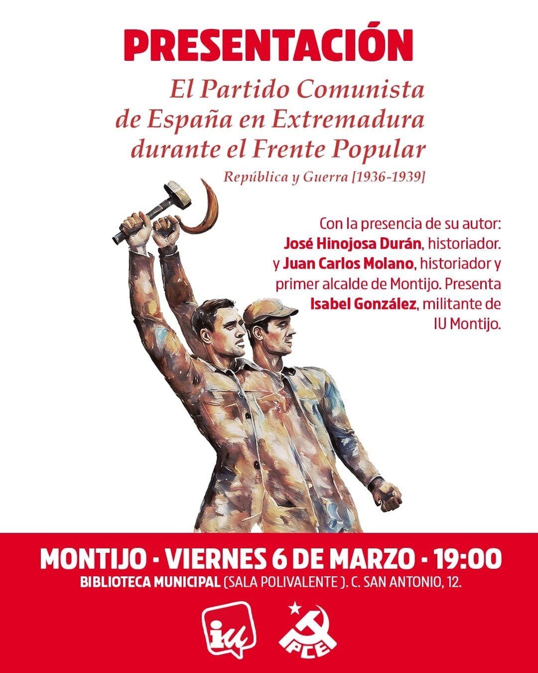 La Biblioteca Municipal de Montijo acoge hoy viernes 6 de marzo, a las 19:00 horas, la presentación del libro “El Partido Comunista de España en Extremadura durante el Frente Popular. República y Guerra (1936-1939)”, del historiador José Hinojosa Durán. Le acompañarán en la presentación Juan Carlos Molano, primer alcalde de la Democracia e historiador, e Isabel González, militante de IU Montijo.