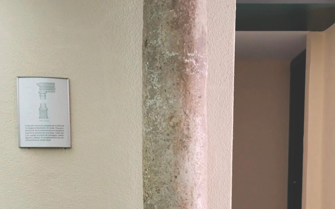 En el recibidor que hay en la planta, antes de acceder al salón de sesiones, puede verse este fuste de columna toscana de la villa romana de Torreáguila, El orden toscano, derivación de la columna etrusca toscánica, supone la adición de una basa, fuste liso y un capital provisto de astrálago, anillo equino y ábaco. El entablamento era de extraordinaria simplicidad.