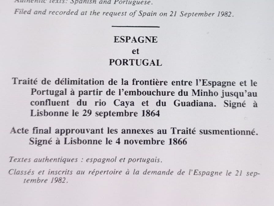 El tratado al que he hecho referencia anteriormente supone un acuerdo fronterizo entre España y Portugal estableciendo las lindes entre ambos países. El tratado denominado de Lisboa fue firmado el 29 de septiembre de 1864 y ratificado en 1865. Por parte Española lo rubricó el Marqués de la Rivera, Facundo Goñi y por parte portuguesa lo hizo el Duque de Loulé, Jacinto Da Silva Mengo, siendo Reina de las Españas Isabel II conocida como «La de los tristes destinos» o «La Reina Castiza» que reinó desde 1833 a 1868 y Rey de Portugal Luís I con un reinado entre 1861 y 1889.