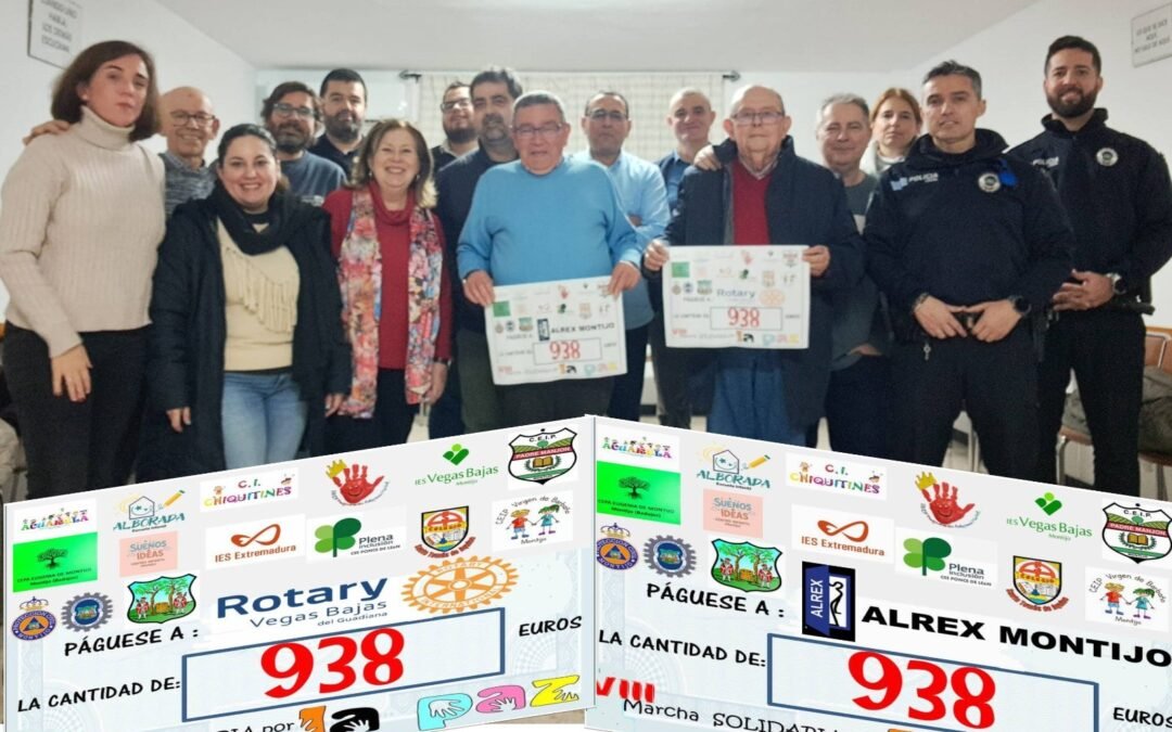 Esta actividad llevaba el llamado “Dorsal Solidario” por el precio de 1,00 euro. Así, en la noche de ayer jueves, en la sede de ALREX-Montijo, nos reunimos con el concejal de Juventud, Mundo Rural y Educación, Blas Martín Lavado, representantes de los organizadores de la VIII Marcha Solidaria por la Paz, Policía Local, junto a representantes de ALREX-Montijo (Alcohólicos Rehabilitados Extremeños) y CLUB ROTARY VEGAS BAJAS. Con la finalidad de entregar a estas dos últimas asociaciones lo recaudado en el Dorsal Solidario: 1876,00 euros, 938,00 euros para Rotary Vegas Bajas y 938,00 euros para ALREX.