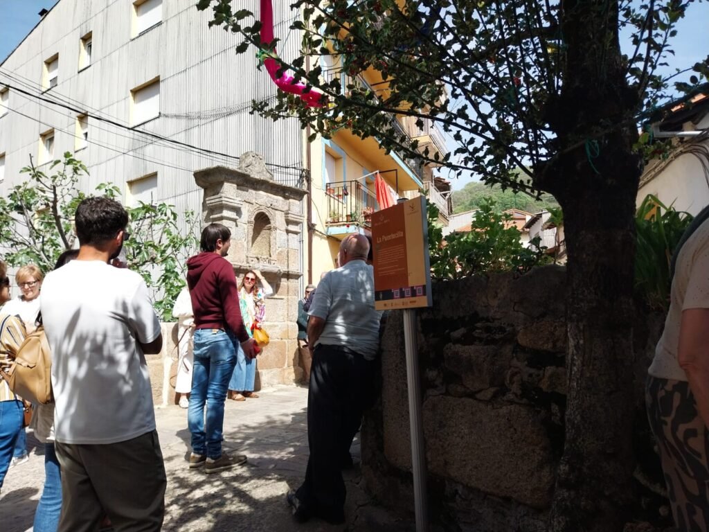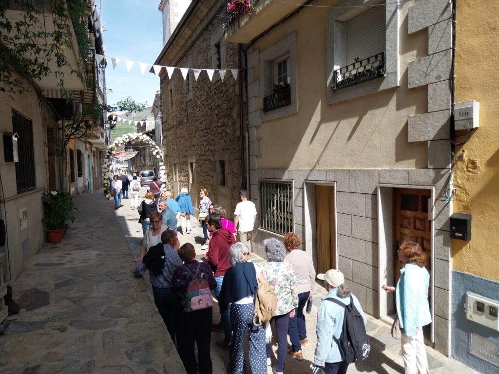Después de una comida de confraternidad, realizamos la visita por Tornavacas de la mano de su Cronista. En primer lugar, visitamos su Centro de Interpretación y Recepción de Visitantes, situado en la planta baja del Ayuntamiento, un edificio que, en tiempos pasados, fue la cárcel de la villa. Aquí tomamos un primer contacto con el patrimonio, naturaleza, historia, etc. y, conocimos la curiosa tradición del “Toque de la esquila”, que consiste en que una mujer, todos los días del año y a la puesta del sol, recorre las calles de Tornavacas, tocando la esquila, para llamar a la oración por todos los difuntos. Allí pudimos conversar con dos de las señoras que continúan ejerciendo esta bonita tradición.