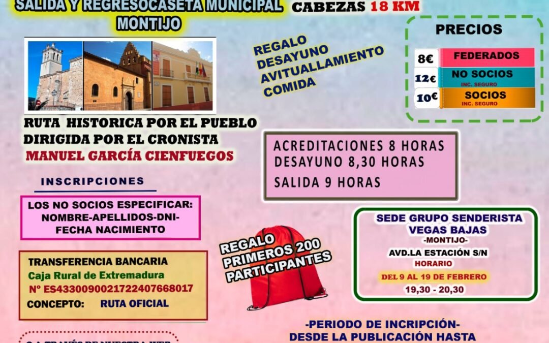 Este año, como novedad, se ha unido a la tradicional Ruta por los Arenales y las Cabezas (18 kms.), una Ruta Histórica por Montijo, que estará guiada por Manuel García Cienfuegos, cronista oficial de Montijo y Lobón. En la que se dará a conocer su historia y patrimonio.